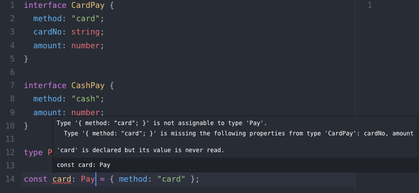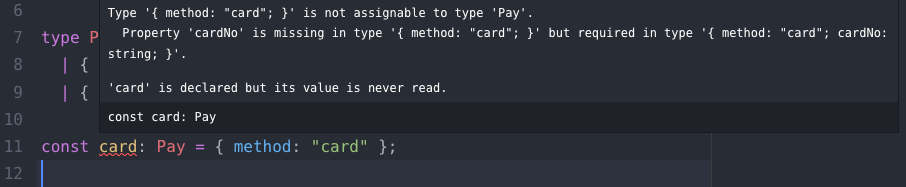type Pay = | { method: "card"; cardNo: string } | { method: "cash"; amount: number };